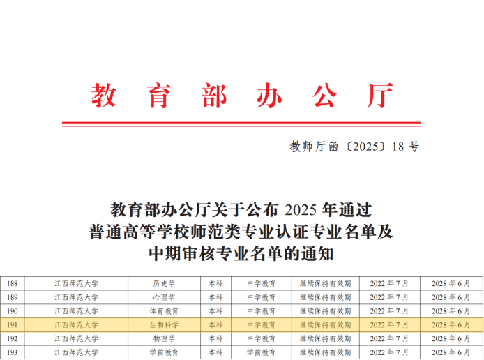 近日,教育部办公厅印发了《教育部办公厅关于公布2025年通过普通高等学校师范类专业认证专业名单及中期审核专业名单的通知》(教师厅函〔2025〕18号)。经高校提交整改材料、专家考查、认证委员会审定,教育部公布了2025年通过师范类专业认证及中期审核的专业名单。其中,学我院生物科学专业顺利通过第二级认证中期审核,继续保持认证有效期(2022年7月—2028年6月)。