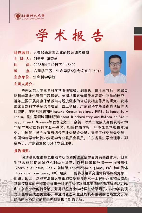 学术讲座预告:昆虫保幼激素合成的转录调控机制